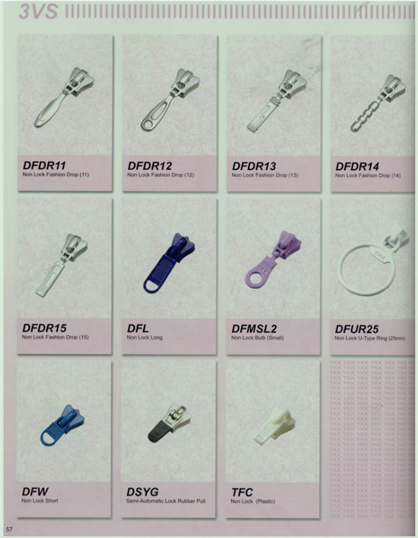 YKK樹(shù)脂牙拉鏈及拉頭、YKK金屬牙拉鏈及拉頭、YKK Y牙牛仔系列拉鏈等。
